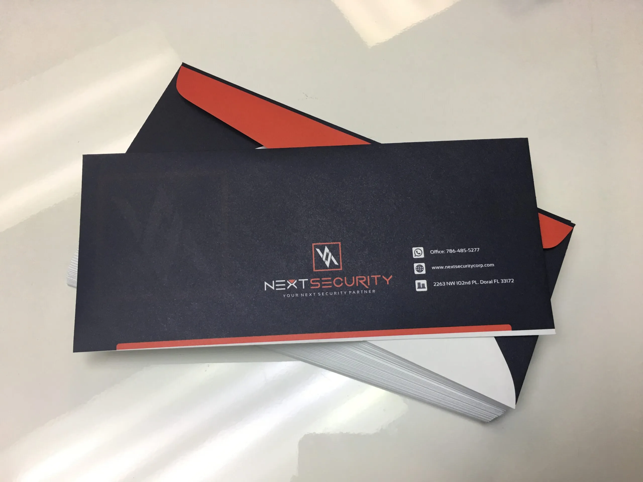 For Next Security, we designed and produced an entire suite of printed collateral — including business cards, letterheads, envelopes, and presentation folders — ensuring each piece reflected the same precision as their signage.